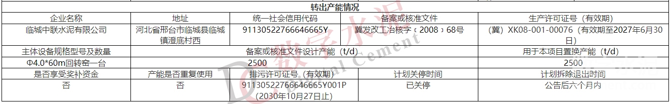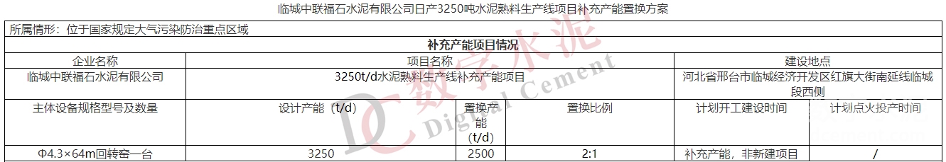 根据公示,临城中联福石水泥有限公司3250t/d水泥熟料生产线补充产能项目设计产能3250t/d,置换产能2500t/d,置换比例为2:1。临城中联水泥有限公司一条2500t/d水泥熟料生产线用于本项目置换产能,目前已关停,计划公告后六个月内拆除退出。