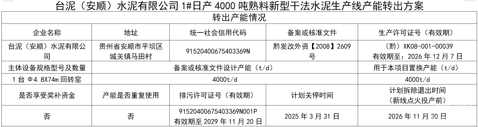 摘要:现对台泥(安顺)水泥有限公司1#日产4000吨熟料新型干法水泥生产线产能转出方案进行公示。